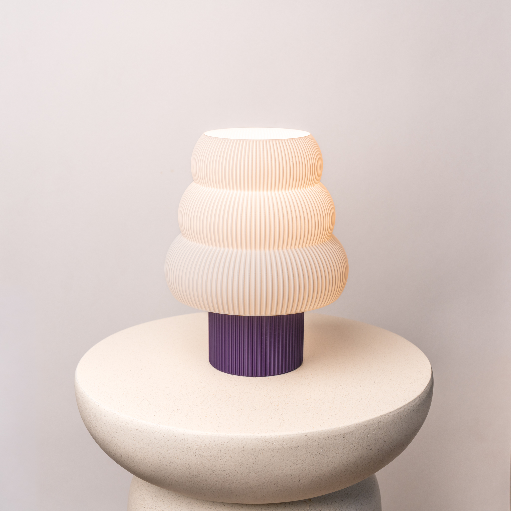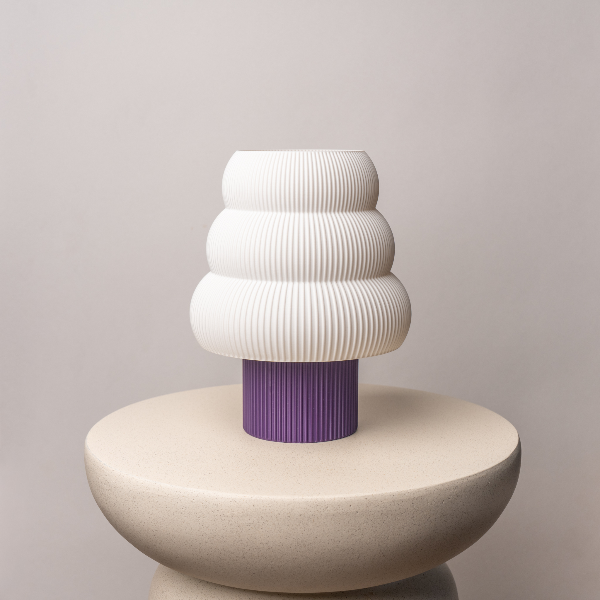 Veioza Cloud este alcătuită din componente modulare care se îmbină într-o formă stratificată, clar definită. Abajurul alb este conceput pentru a oferi lumină directă și eficientă, fiind potrivit pentru citit, birou sau zone care au nevoie de iluminare funcțională, fără a deveni agresivă vizual. Baza în nuanță de mov adaugă un accent cromatic discret, iar modularitatea permite schimbarea bazei sau a abajurului, oferind flexibilitate și posibilitatea de a adapta veioza în timp. Cloud devine astfel un obiect care poate fi reconfigurat, nu înlocuit. Design responsabil, produs local Abajurul și baza sunt realizate din bioplastic pe bază de plante, un material ales pentru proprietățile sale optice și impactul redus asupra mediului. Veioza este produsă local de Artea, în serii controlate, cu risipă minimă de material. Designul original aparține Flowalistik Studio, iar producția este realizată de Artea, cu atenție la detalii și la funcționalitatea modulară a fiecărui element.